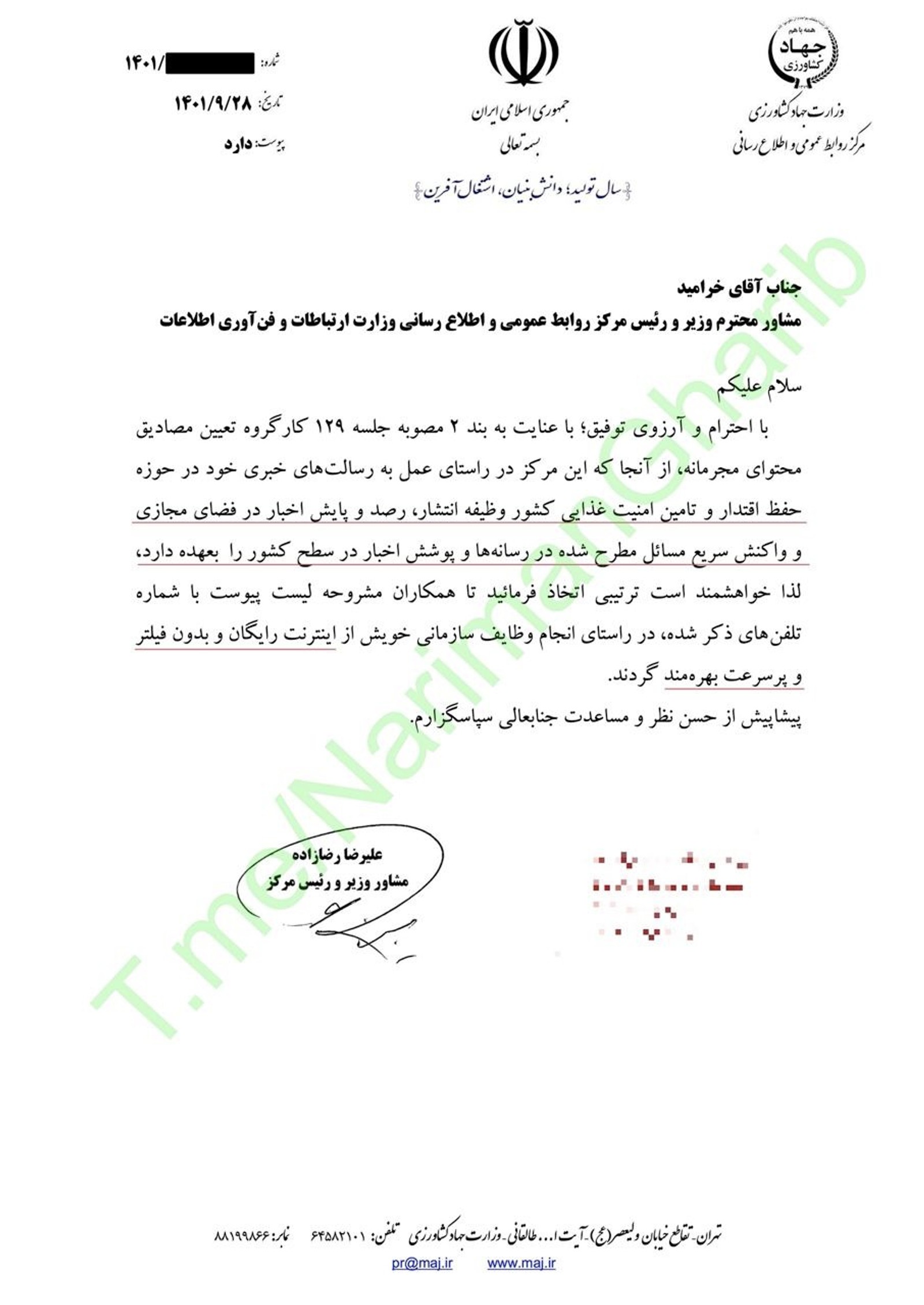 در یکی از این نامه‌ها، علیرضا رضازاده، مشاور وزیر و رییس مرکز روابط عمومی و اطلاع‌رسانی وزارت جهاد کشاورزی، از وزارت ارتباطات درخواست کرده تا با توجه به یکی از مصوبات کارگروه تعیین مصادیق محتوای مجرمانه، اینترنت «رایگان، بدون فیلتر و پرسرعت» در اختیار افراد اعلام شده در فهرست نامه قرار بگیرد.