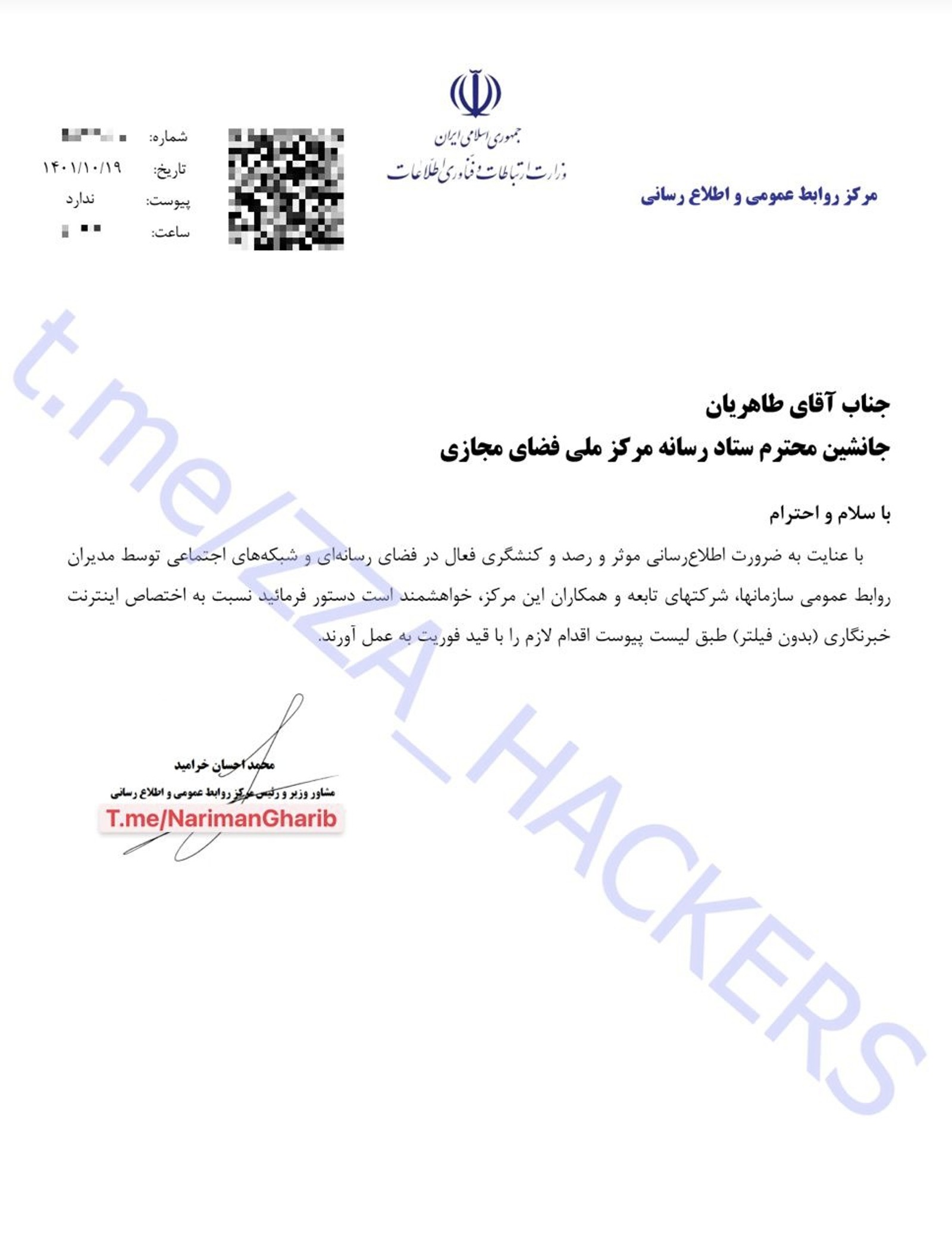 در همان روز، محمد احسان خرامید، رییس مرکز روابط عمومی وزارت ارتباطات و فن‌آوری اطلاعات، با ارسال نامه‌ای به مرکز ملی فضای مجازی، از این نهاد درخواست کرده تا به فهرست اسامی و شماره تلفن‌های پیوست نامه «اینترنت خبرنگاری» و بدون فیلتر اختصاص یابد.