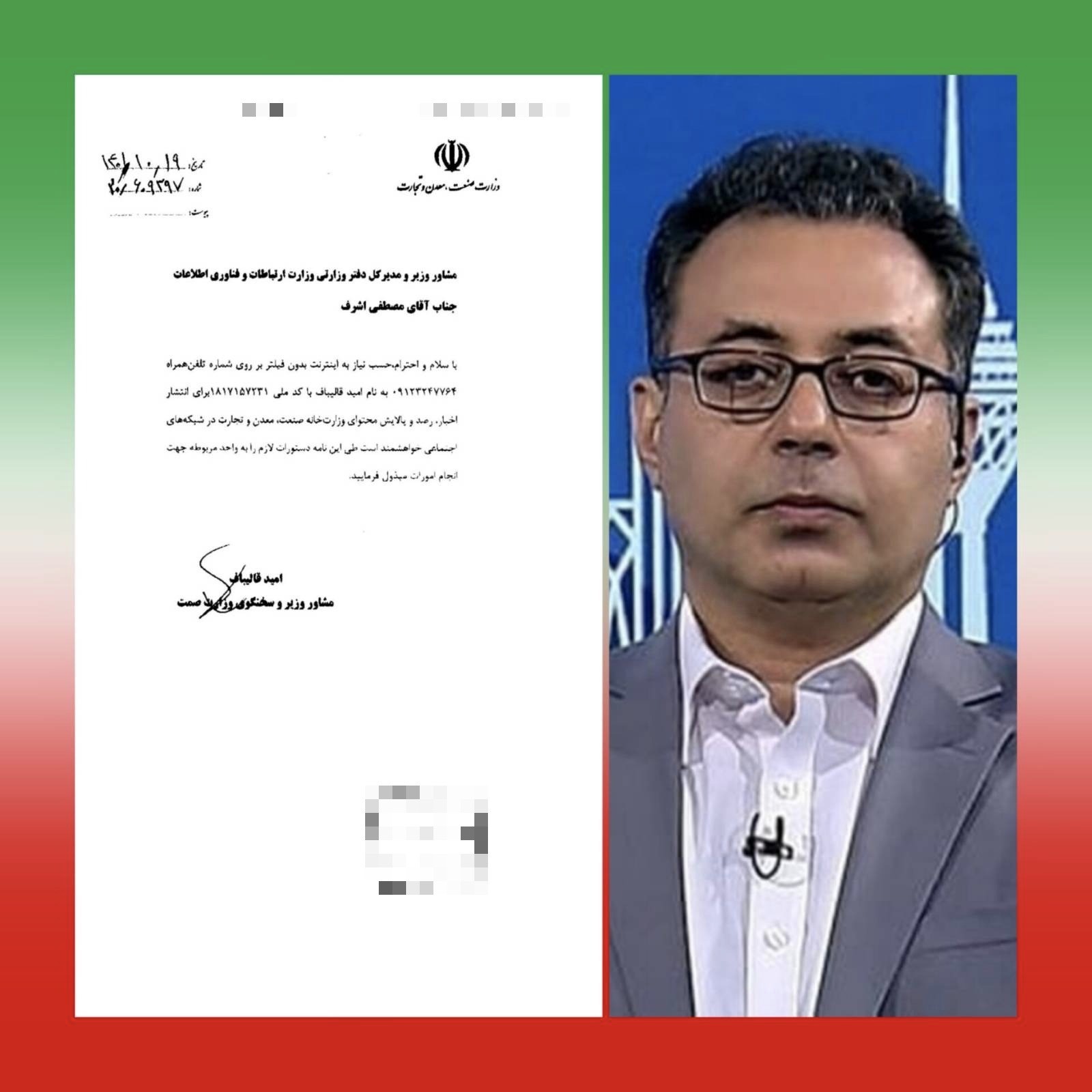 در نامه دیگری به تاریخ ۱۹ دی ۱۴۰۱ با امضای امید قالیباف، مشاور وزیر و سخنگوی وزارت صنعت، معدن و تجارت، او با ارسال شماره شخصی خود از وزارت ارتباطات درخواست کرده تا دستورات لازم برای فعال‌سازی اینترنت بدون فیلتر روی خط تلفن همراهش داده شود.