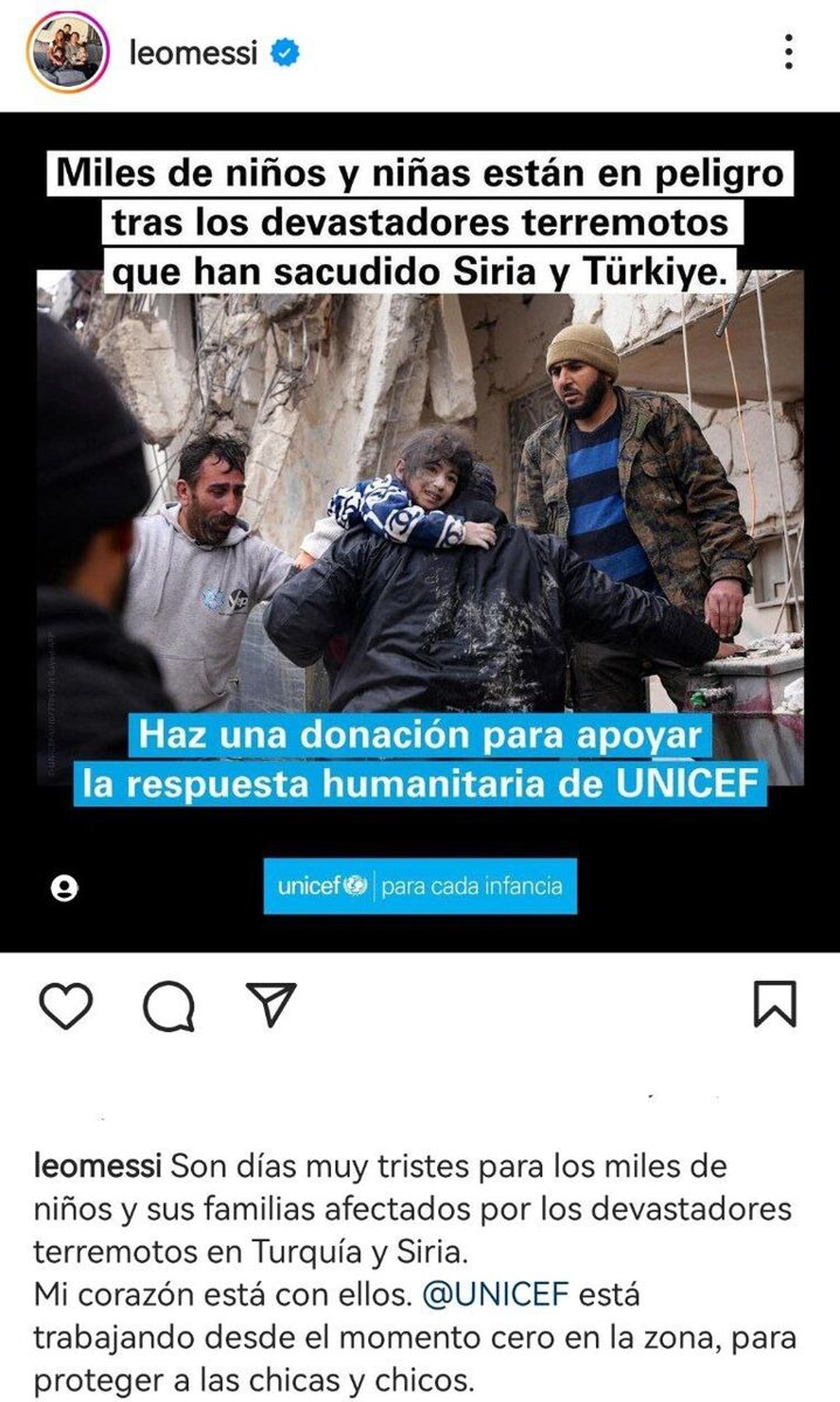 لیونل مسی، کاپیتان تیم ملی آرژانتین و ستاره پاری‌سن‌ژرمن نوشت: «روزهای بسیار غم‌انگیزی برای هزاران کودک و خانواده‌هایشان است که از زلزله‌های ویرانگر ترکیه و سوریه آسیب دیده‌اند. قلب من با آنهاست. یونیسف در منطقه برای محافظت از دختران و پسران کار می‌کند. کمک شما قابل تقدیر است.»