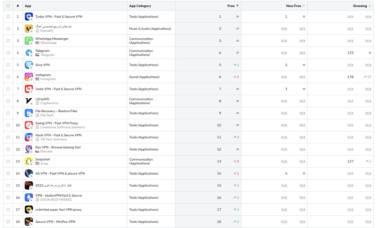 بر اساس داده‌های شرکت Data.ai که وضعیت بازار اپلیکیشن‌ها در جهان را رصد می‌کند، ۲۹ جایگاه از فهرست ۵۰ اپلیکیشن برتر گوگل پلی در ایران در اختیار برنامه‌های دور زدن فیلترینگ است.