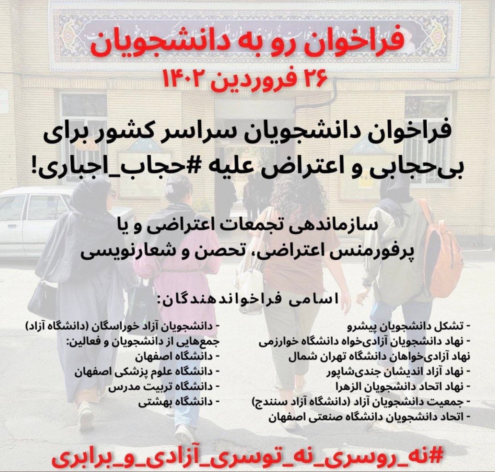 در حالی که اعمال سرکوب‌ علیه شهروندان معترض به «حجاب اجباری» و دیگر سیاست‌های ناکارآمد حاکمیت همچنان ادامه دارد، تعدادی از تشکل‌های دانشجویی سراسر کشور برای برگزاری تجمع اعتراضی علیه حجاب اجباری در روز ۲۶ فروردین فراخوان دادند.