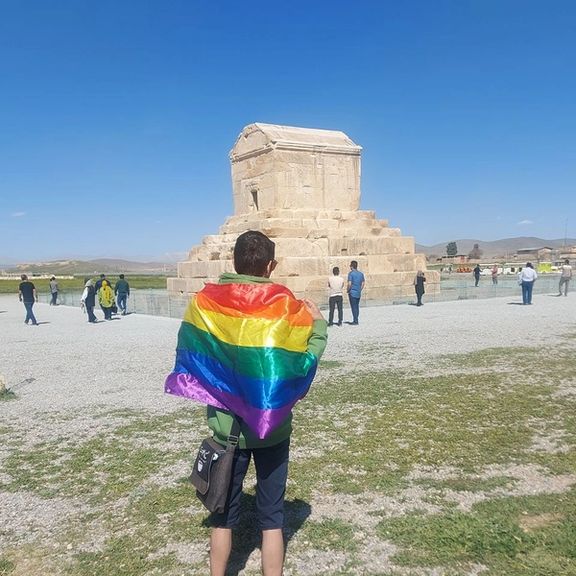 تصاویر رسیده به ایراناینترنشنال شهروندی را نشان میدهد که مقابل آرامگاه کوروش در پاسارگاد پرچم رنگینکمان را در حمایت از جامعه کوییر به نمایش گذاشته است.