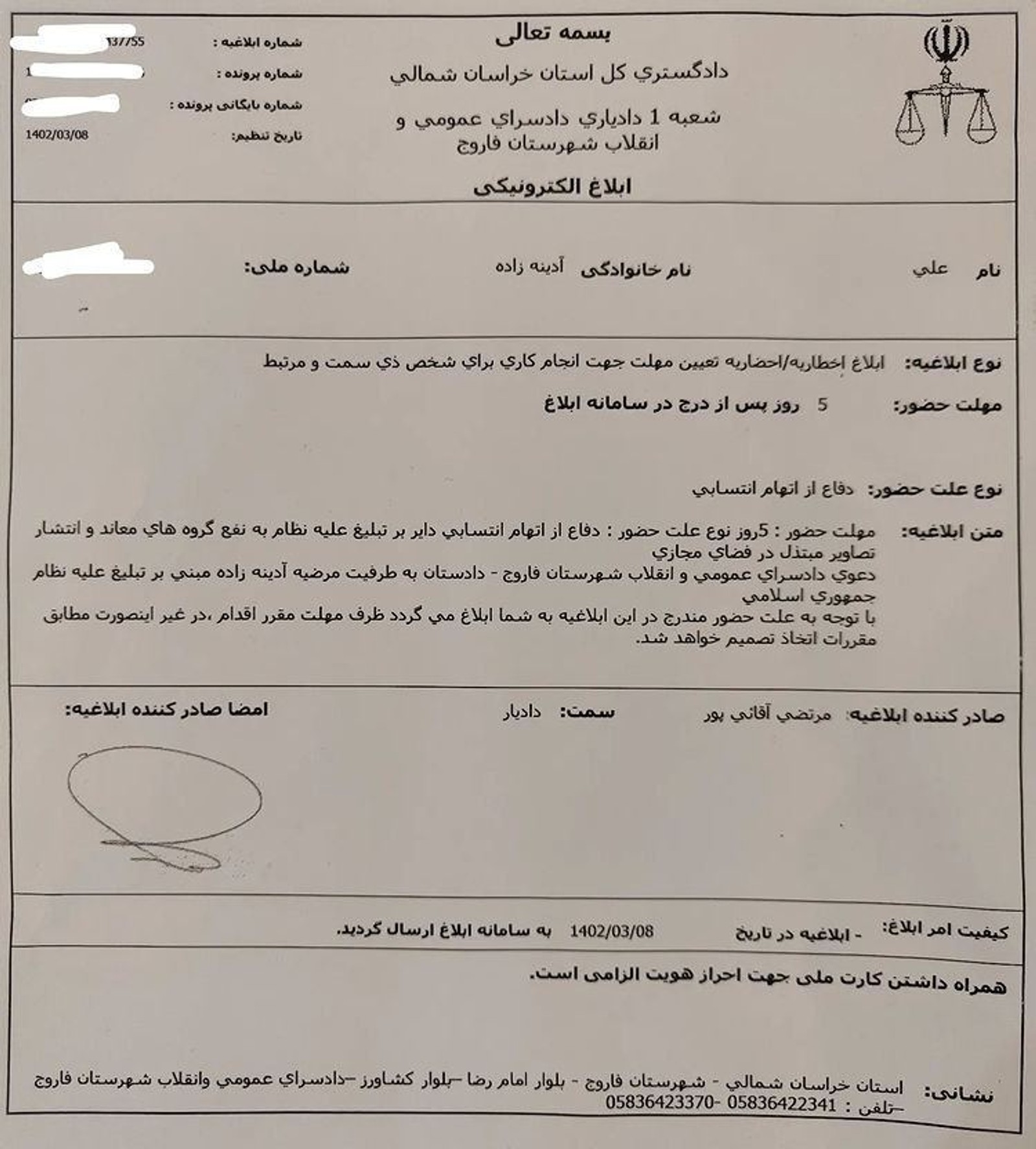 این احضاریه در حالی برای حضور در «دادسرای عمومی و انقلاب شهرستان فاروج» صادر شده که به گفته او، پیش از آن هیچ اطلاعیه یا حتی پیامکی درباره این آن برای آنها ارسال نشده بود.