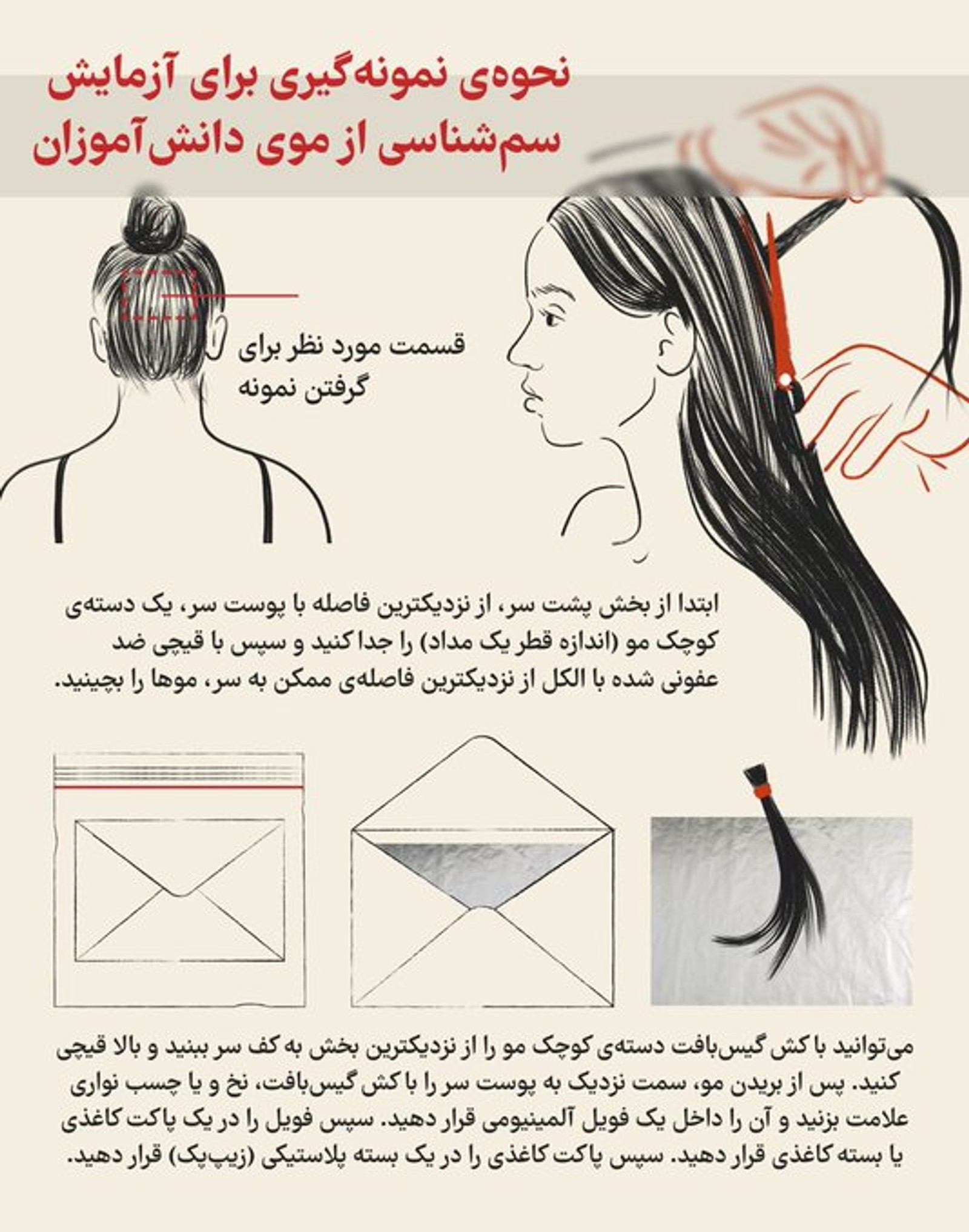 این حساب کاربری همچنین دستورالعملی برای گرفتن نمونه آزمایشی از دانشآموران مسموم شده منتشر کرده که شامل چگونگی بریدن دستهای از موی فرد مسموم شده و نحوه بستهبندی نمونه، برای ارسال است.
