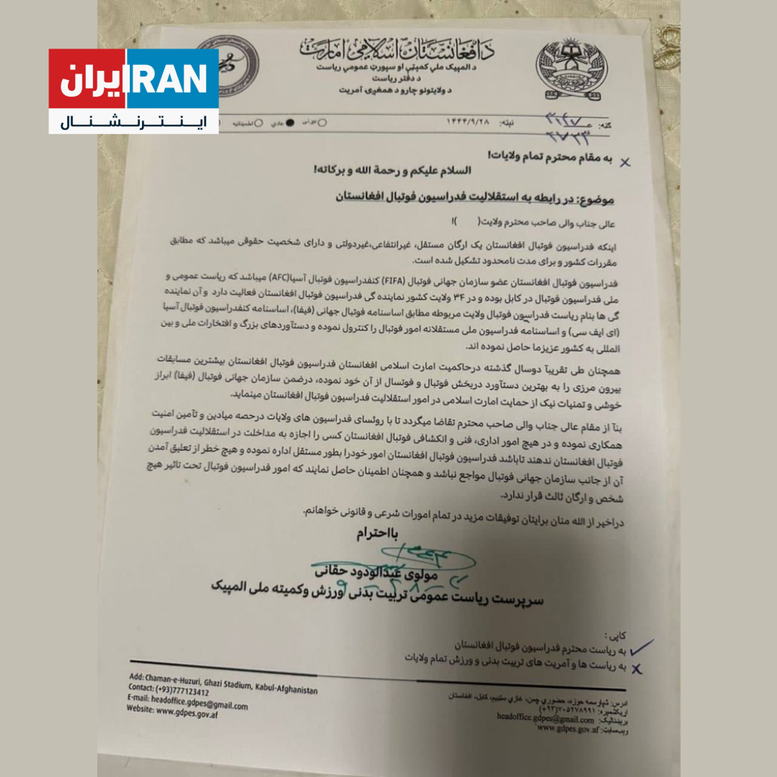 در این نامه که با سربرگ کمیته ملی المپیک برای مقامات ولایات افغانستان ارسال شده، فوتبال به عنوان «یک ارگان مستقل، غیرانتفاعی، غیردولتی و دارای شخصیت حقوقی» شناخته شده است. در ادامه هم از مقامات ولایات درخواست میشود که برای جلوگیری از تعلیق، از دخالت «در امور اداری، فنی و… فوتبال» خودداری و تنها در بخش تامین امنیت با مسئولان فوتبال هر ولایت همکاری کنند. ضمن اینکه مسئولان هر ولایت علاوه بر عدم مداخله، باید اطمینان حاصل کنند که امور فدراسیون فوتبال تحت تاثیر هیچ شخص سوم قرار ندارد.