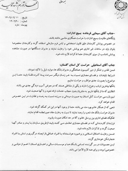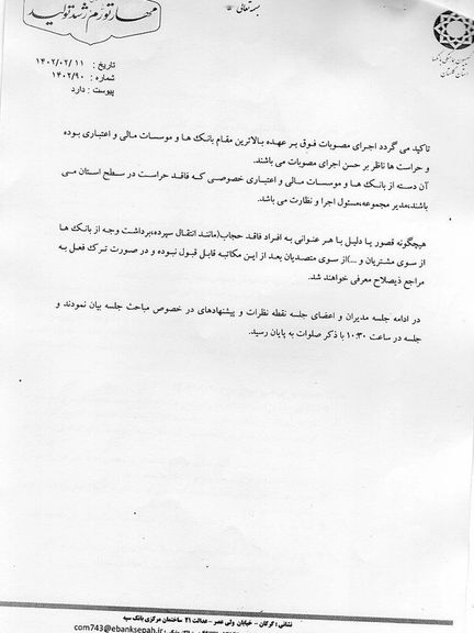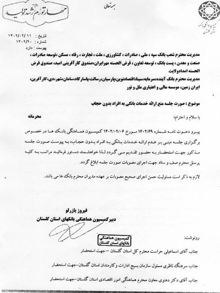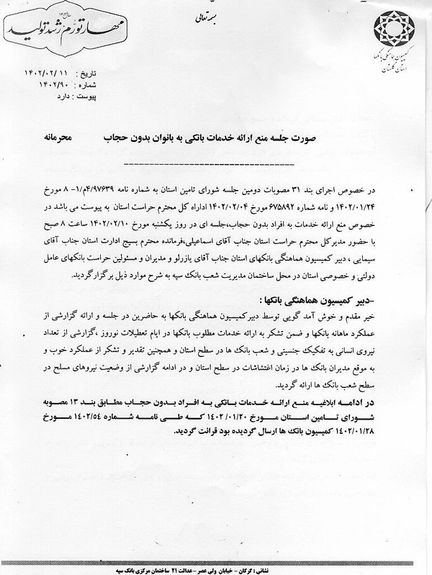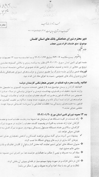 در این نامه آمده که چند روز قبل از آن، در ششم اردیبهشت، کمیسیون هماهنگی بانکها، جلسهای را برای عدم ارائه خدمات بانکی به زنان بدون حجاب اجباری برگزار کرده و مصوبات آن جلسه، اکنون باید اجرا شود.