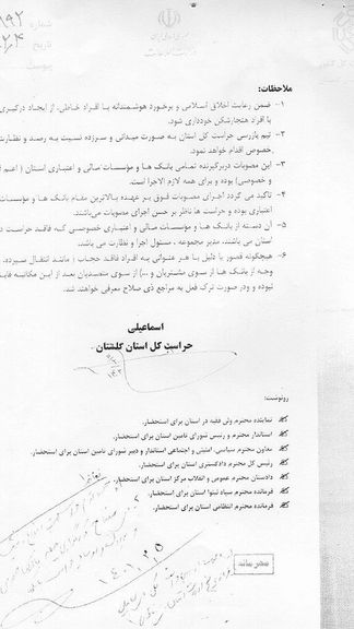 این اسناد شامل یک نامه «محرمانه» از سوی فیروز یازرلو، دبیر کمیسیون هماهنگی بانکهای استان گلستان، به تاریخ یازدهم اردیبهشت و خطاب به مدیران بانکهای مختلف در این استان است.