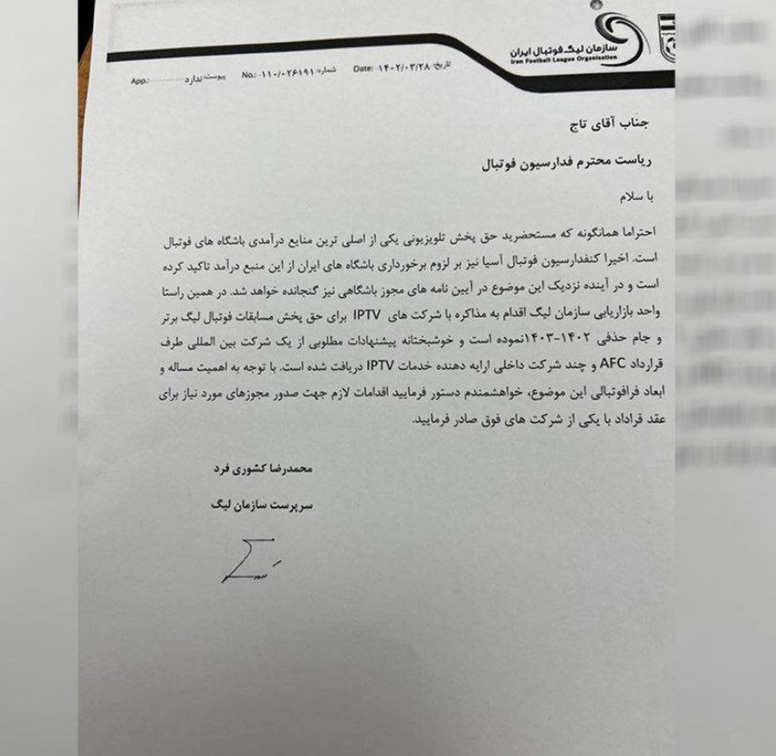 سرپرست سازمان لیگ فوتبال در نامه‌ای به مهدی تاج درباره مذاکره با چند تلویزیون اینترنتی برای حق پخش تلویزیونی مسابقات فوتبال نوشته: «پیشنهادهای مطلوبی از یک شرکت طرف قرارداد AFC و چند شرکت داخلی خدمات IPTV دریافت شده» او در ادامه خواستار صدور مجوز برای شبکه‌های تلویزیونی شده است.
