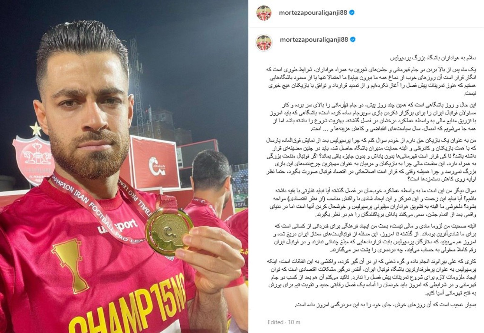 مرتضی پورعلی گنجی در این پست مفصل اینستاگرامی نوشته است: «یک ماه پس از بالا بردن دو جام قهرمانی و جشن‌های شیرین به همراه هواداران، شرایط طوری است که انگار قرار است آن روزهای خوب از دماغ همه ما بیرون بیاید! ما احتمالا تنها یا از معدود باشگاه‌هایی هستیم که هنوز تمرینات پیش فصل را آغاز نکرده‌ایم و از تمدید قرارداد و توافق با بازیکنان هیچ خبری نیست.