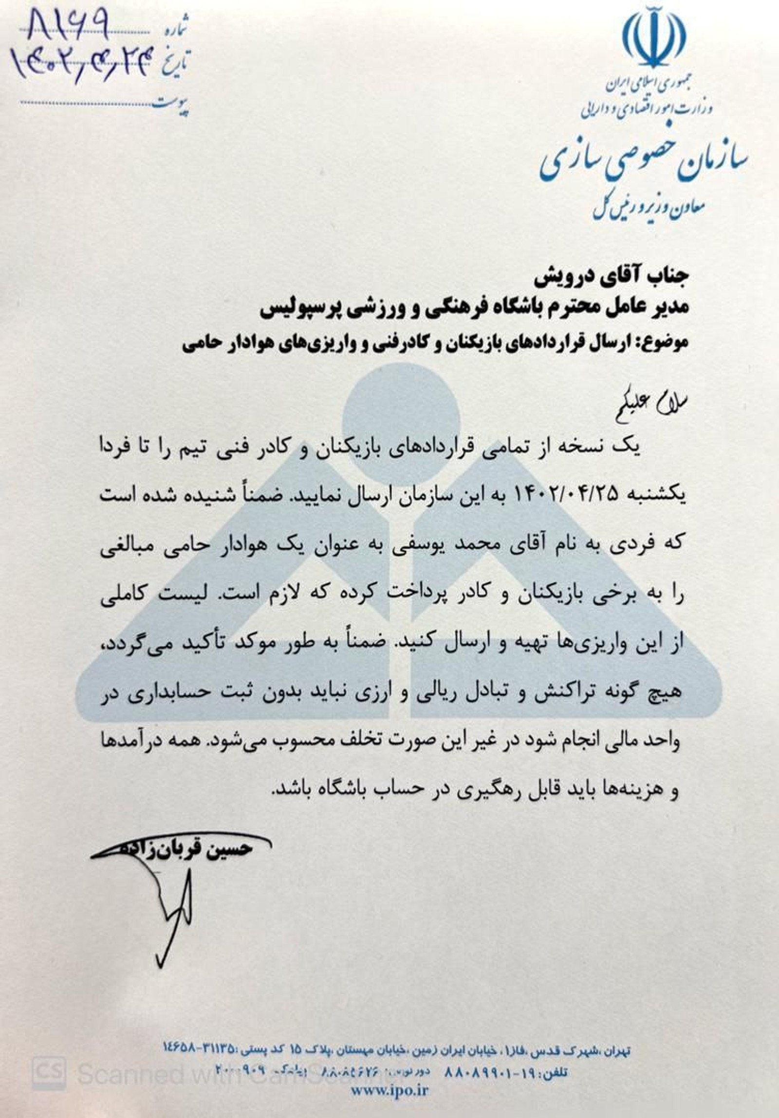 در نامه‌ای که عصر دیروز از طرف قربانزاده به مدیرعامل پرسپولیس نوشته شده و رسانه‌های ایران منتشر کرده‌اند، آمده است: «یک نسخه از تمامی قراردادهای بازیکنان و کادر فنی تیم را تا فردا یکشنبه ۱۴۰۲/۰۴/۲۵ به این سازمان ارسال نمایید ضمناً شنیده شده است که فردی به نام آقای محمد یوسفی به عنوان یک هوادار حامی مبالغی را به برخی بازیکنان و کادر پرداخت کرده که لازم است لیست کاملی از این واریزی ها تهیه و ارسال کنید ضمناً به طور موکد تأکید میگردد، هیچ گونه تراکنش و تبادل ریالی و ارزی نباید بدون ثبت حسابداری در واحد مالی انجام شود در غیر این صورت تخلف محسوب میشود. همه درآمدها و هزینه ها باید قابل رهگیری در حساب باشگاه باشد.»