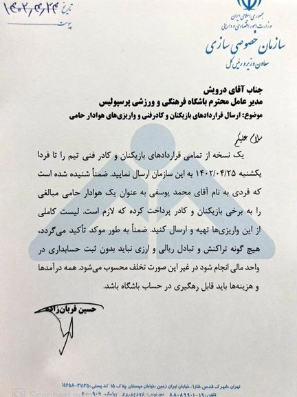 در پی تایید کمکهای مالی فردی در دوبی به پرسپولیس، حسین قربانزاده، رئیس سازمان خصوصیسازی در نامهای به رضا درویش، مدیرعامل پرسپولیس خواستار شفافسازی شد: «شنیده شده فردی به اسم محمد یوسفی مبالغی را به بازیکنان و کادر فنی پرداخت کرده، لیست آنها را بفرستید.»