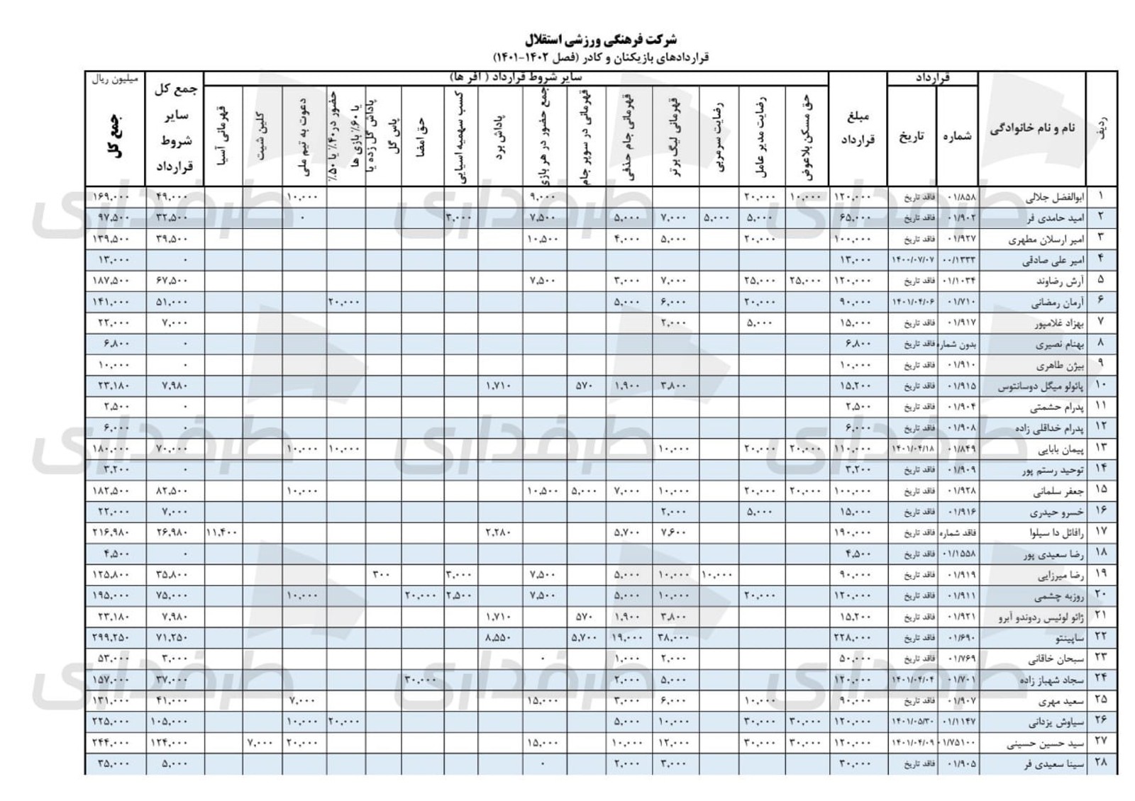 سایت طرفداری، قراردادهای فصل گذشته استقلال را منتشر کرده است. در این جدول، نکات عجیبی وجود دارد، بازیکنانی مثل سیاوش یزدانی، ابوالفضل جلالی، آرش رضاوند و جعفر سلمانی که کمترین دقایق بازی را داشتند، جمعا ۱۰۰ میلیارد گرفته‌اند. حسین حسینی هم از بیرانوند گرانتر بوده است.
