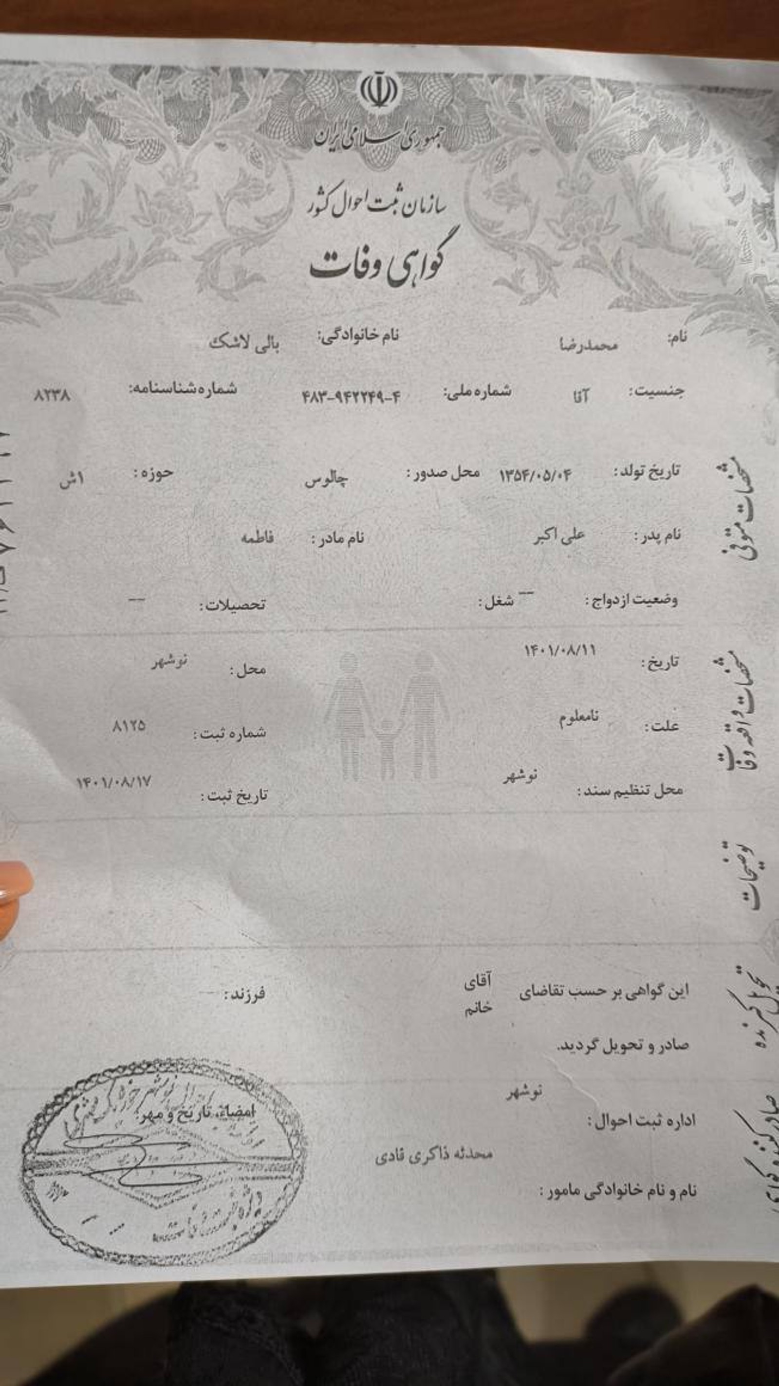 بر اساس جدیدترین اطلاعات رسیده به ایران اینترنشنال، در گواهی فوت محمدرضا بالی لاشک، شهروند ۴۷ساله ساکن نوشهر که روز چهارشنبه، ۱۱ آبان ۱۴۰۱ توسط ماموران امنیتی کشته شد، علت مرگ را «نامعلوم» درج کرده‌اند.