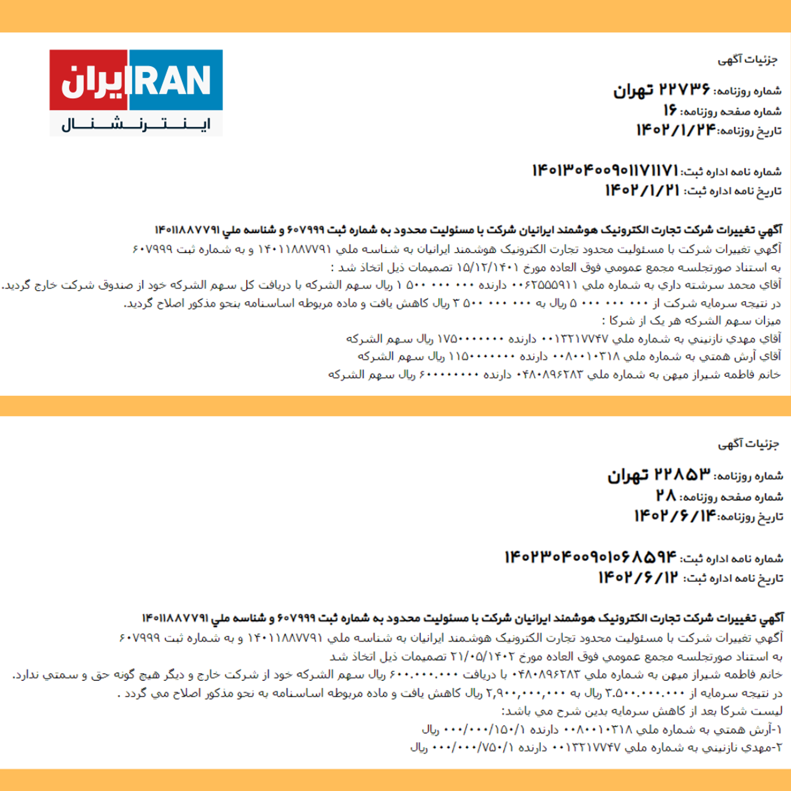 در ادامه آگهی تغییرات این شرکت با مضمون خروج سرمایه محمد سررشتهداری، مدیر مارکتینگ سابق استقلال که مدتی به عنوان مدیر رسانه این باشگاه هم مشغول به کار بود، در فروردین ۱۴۰۲ ثبت شد و یک روز پیش از انتشار رسمی خبر انتخاب این شرکت به عنوان کارگزار تیمهای ملی در سایت فدراسیون، پنجمین آگهی تغییرات این شرکت از زمان تاسیس مبنی بر خروج سرمایه فاطمه شیرازمیهن در روزنامه رسمی منتشر شد تا سرمایه باقیمانده در این شرکت، ۲۹۰ میلیون تومان باشد.