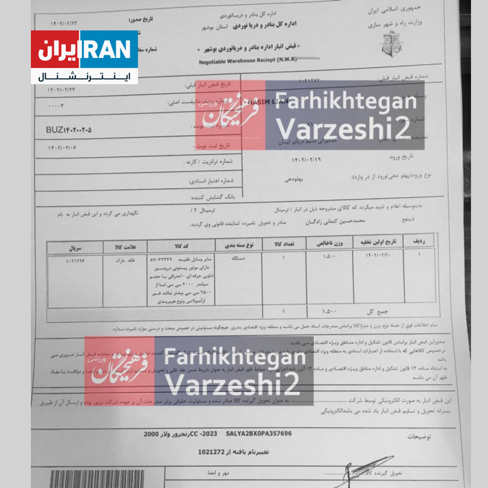 فرهیختگان سندی از «قبض انبار اداره بنادر و دریانوردی» بوشهر منتشر کرده که نشان میدهد خودروی گرانقیمت محمدحسین کنعانیزادگان، ملیپوش پرسپولیس که با مجوز دولت جمهوری اسلامی وارد شده، تا ۱۰۰ میلیارد تومان قیمتگذاری شده است.