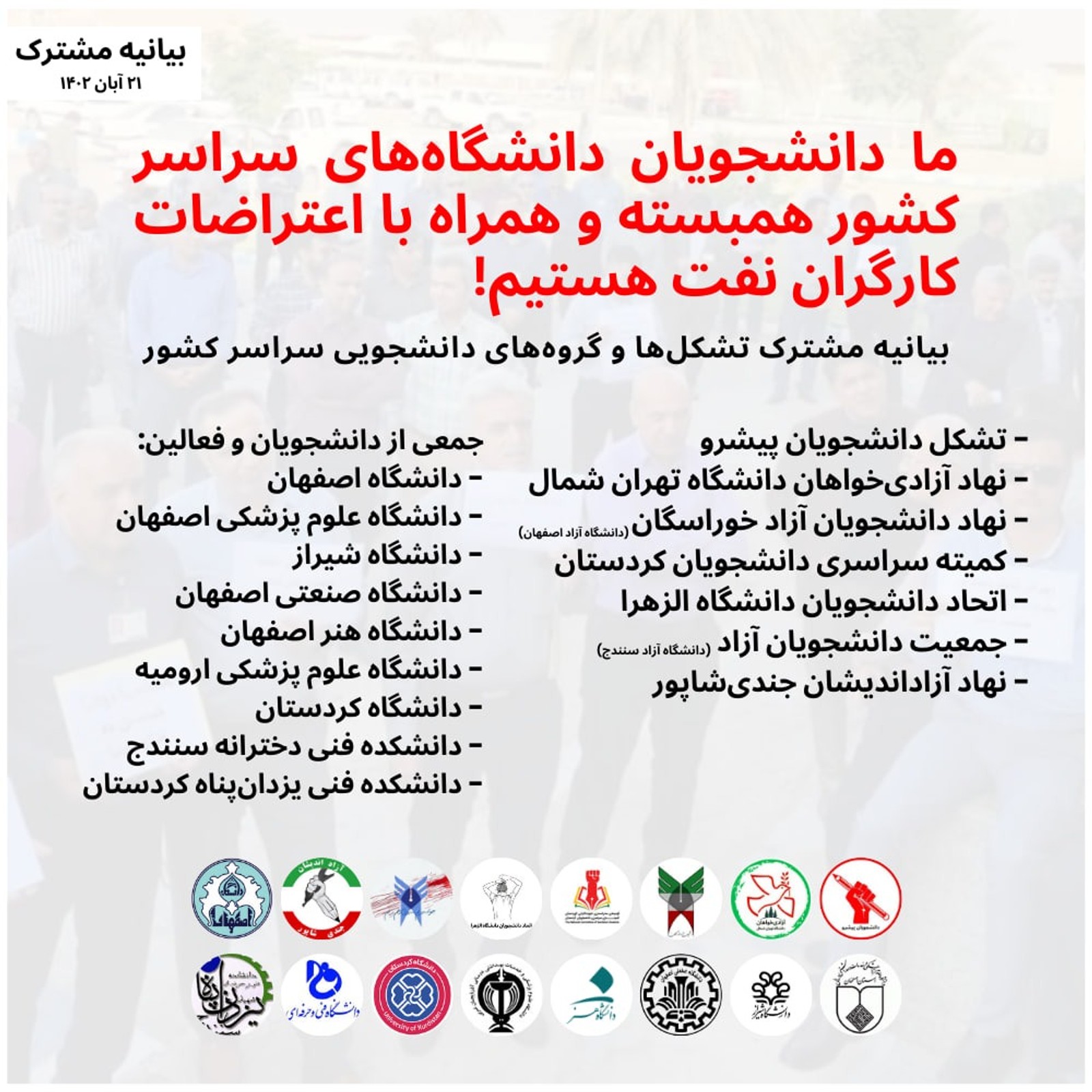 جمعی از دانشجویان و فعالین دانشجویی ۹ دانشگاه کشور از جمله دانشگاه اصفهان، دانشگاه علوم پزشکی اصفهان، دانشگاه شیراز، دانشگاه صنعتی اصفهان، دانشگاه هنر اصفهان، دانشگاه علوم پزشکی ارومیه، دانشگاه کردستان، دانشکده فنی دخترانه سنندج، دانشکده فنی یزدانپناه کردستان و دانشکده فنی یزدانپناه کردستان، دیگر امضاکنندگان این بیانیهاند که از اعتراضتات کارگران نفت و پتروشیمی حمایت کردهاند.