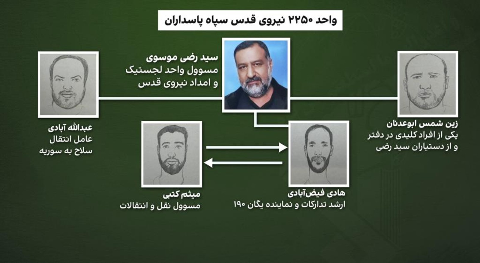 طبق این اطلاعات، میثم کتبی، مسئول انتقالات پیشین این گروه بود که حالا جایش را به هادی فیض آبادی داده است. فیض‌آبادی ارشد تدارکات و نماینده یگان ۱۹۰ نیروی قدس است و مسئول این یگان بهنام شهریاری است.