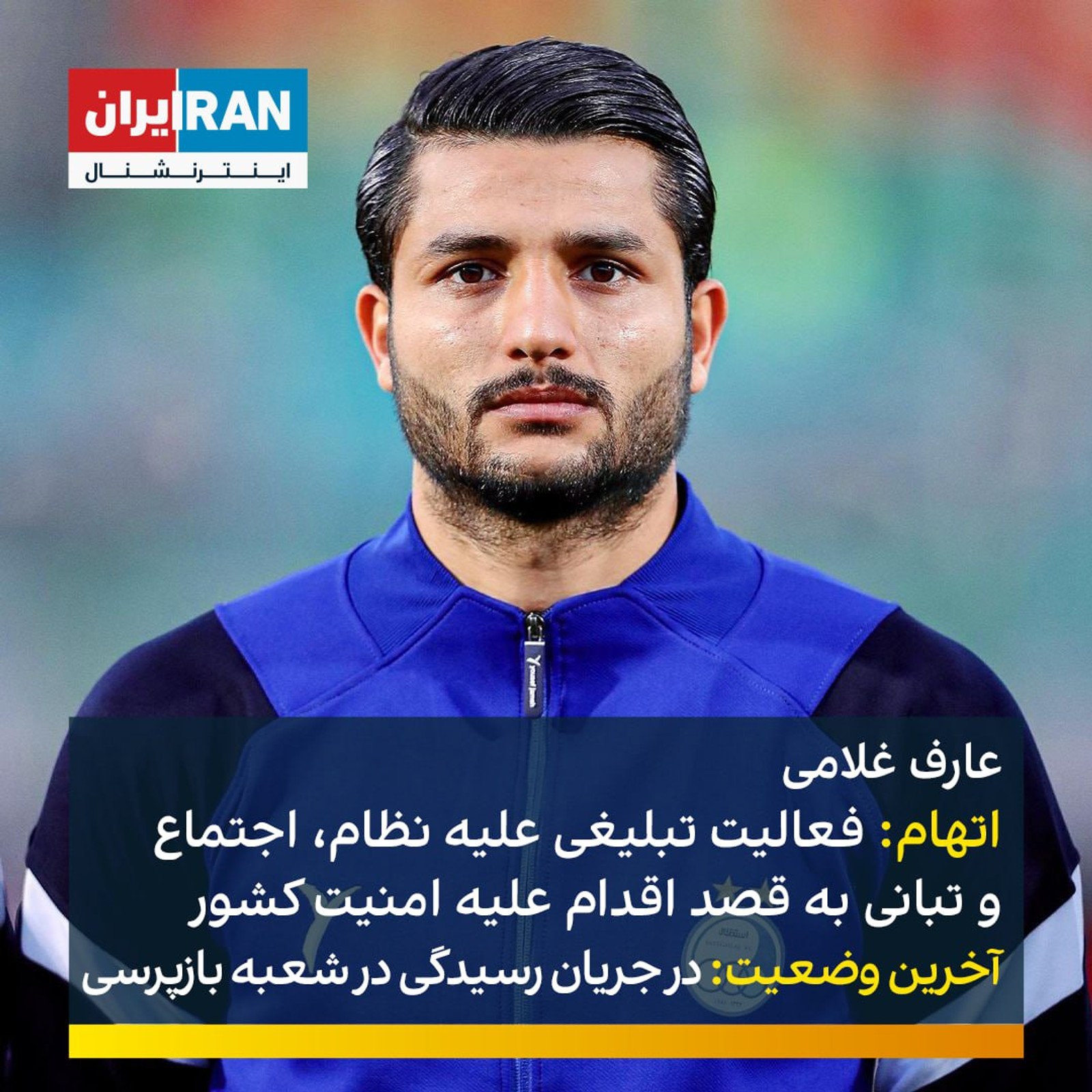 عارف غلامی، بازیکن سابق استقلال، در پرونده به شماره کلاسه ۳/۰۱۰۱۳۷۵ب به فعالیت تبلیغی علیه نظام، اجتماع و تبانی به قصد اقدام علیه امنیت کشور متهم شده که پرونده در جریان رسیدگی در شعبه سوم بازپرسی است.