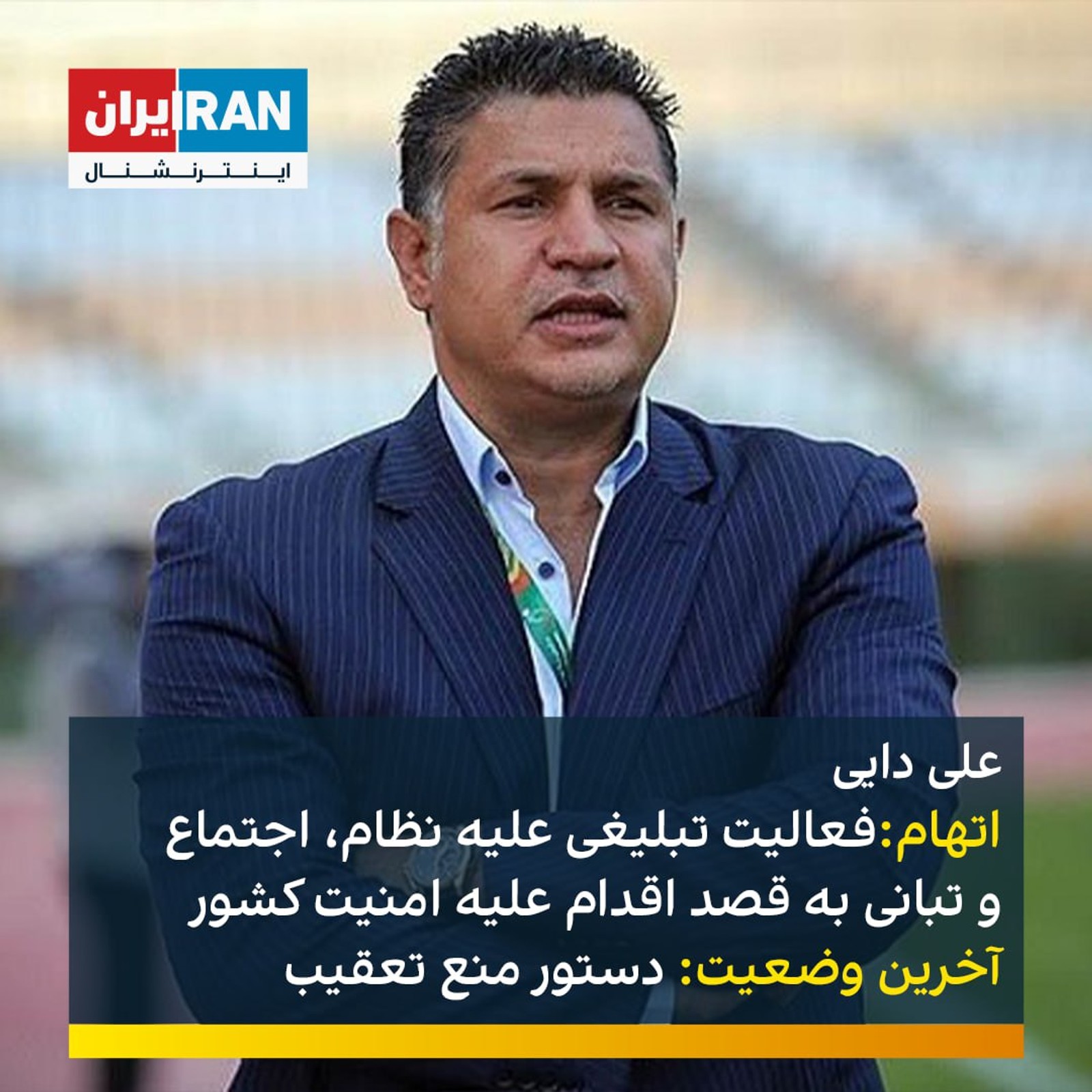 علی دایی، اسطوره فوتبال ایران، در پرونده به شماره کلاسه ۱/۰۱۰۱۰۸۰ب به فعالیت تبلیغی علیه نظام، اجتماع و تبانی به قصد اقدام علیه امنیت کشور متهم شده که در نهایت پرونده به صدور قرار منع تعقیب منتهی شده است.