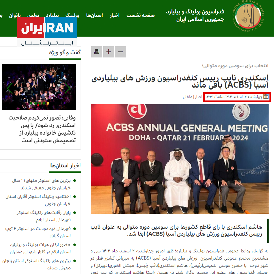 فدراسیون بولینگ و بیلیارد ایران روز گذشته با انتشار خبری کذب روی سایت رسمی فدراسیون، از انتخاب هاشم اسکندری به عنوان نایبرئیس کنفدراسیون ورزشهای بیلیاردی آسیا (ACBS) خبر داد در حالی که در خبر برگزاری مجمع این نهاد روی وبسایت رسمی ACBS، نام او وجود ندارد.