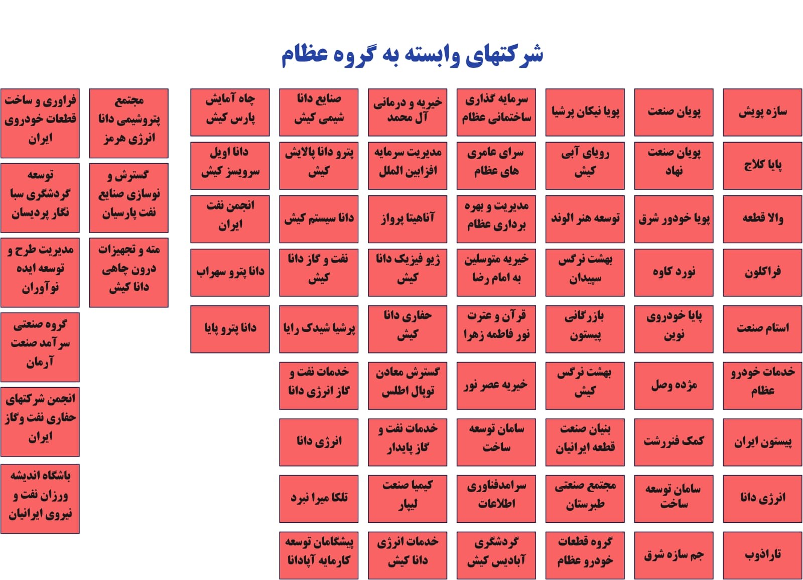 هلدینگ گروه عظام براساس اطلاعات موجود در وب‌سایت رسمی آن، متشکل از بیش از ۱۰ شرکت به نام‌های شرکت پیستون ایران، شرکت فرآوری و ساخت، شرکت پایاکلاچ، شرکت سازه سیم‌پویش، شرکت استام‌صنعت، شرکت والا قطعه، شرکت صنایع طه، شرکت پایا ذوب کاوه، شرکت تارا ذوب، شرکت پایا خودرو نوین، شرکت پویان‌صنعت نهاد و... است که در کنار شرکت کروز به دو غول صنعت قطعه‌سازی ایران معروف شده‌اند.