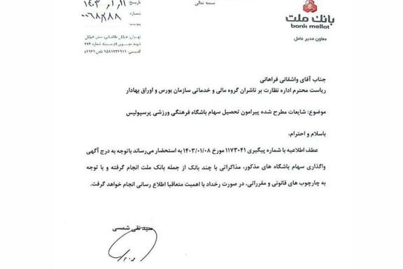بانک ملت با انتشار نامهای روی سامانه کدال خطاب به سازمان بورس و اوراق بهادار، تایید کرده با این بانک مذاکرات جهت واگذاری سهام پرسپولیس انجام شده است. این نامه در پاسخ به ابهاماتی درباره تمایل بانک ملت به مالکیت پرسپولیس منتشر شده است.