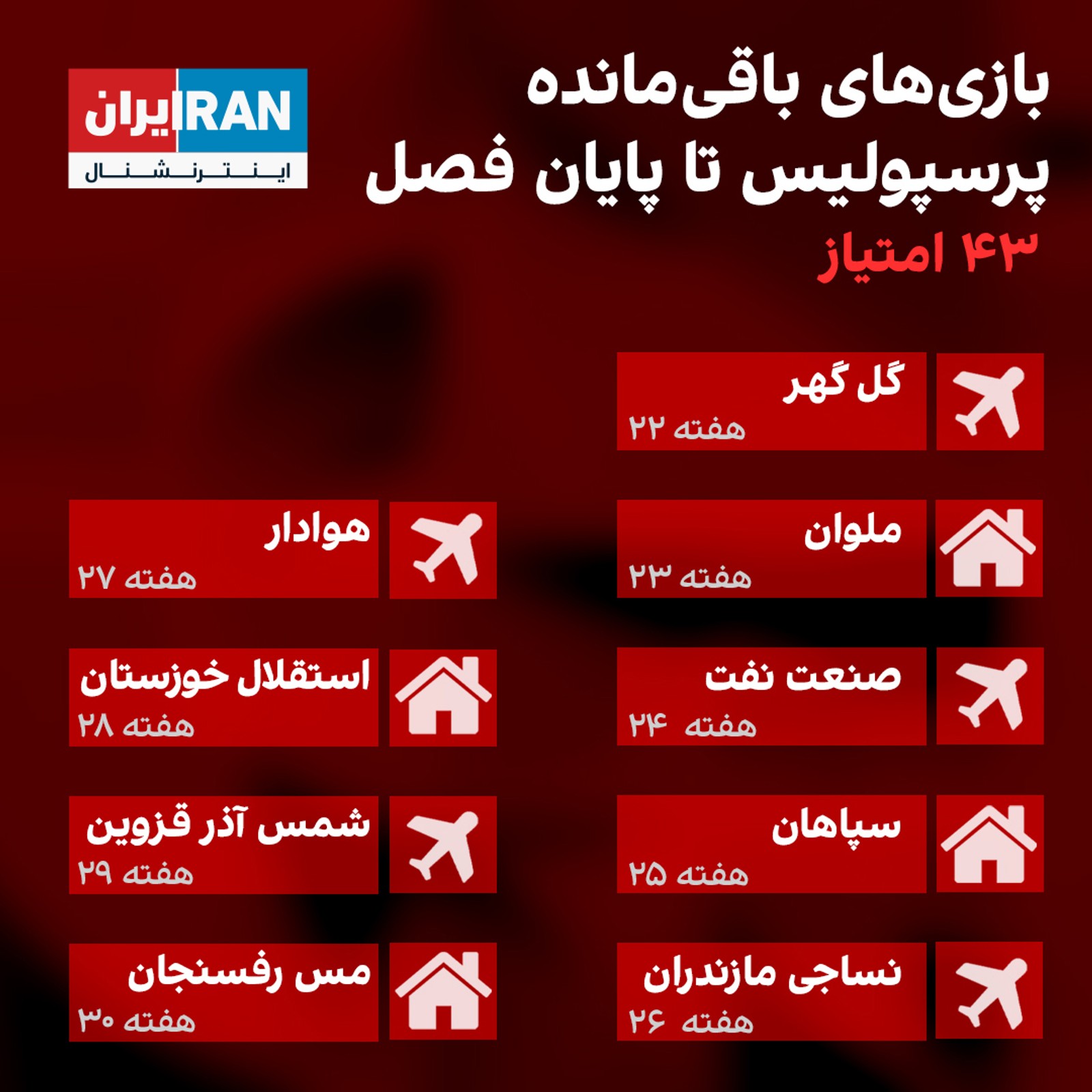 پرسپولیس هم پنج بازی خارج از خانه در شهرهای سیرجان، آبادان، مازندران، تهران (هوادار) و قزوین پیش رو خواهد داشت.