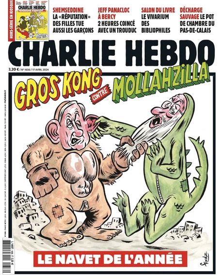 نشریه فرانسوی «شارلی ابدو» تصویر صفحه نخست شماره جدید خود را به تنشهای جدید بین اسرائیل و جمهوری اسلامی اختصاص داد. این نشریه تصویری کاریکاتوری از بنیامین نتانیاهو و علی خامنهای منتشر کرد و با الهام از شخصیتهای خیالی «کینگ کُنگ» و «گودزیلا»، نوشته است: «گروس کُنگ در مقابل مُلازیلا: بدترین فیلم سال»