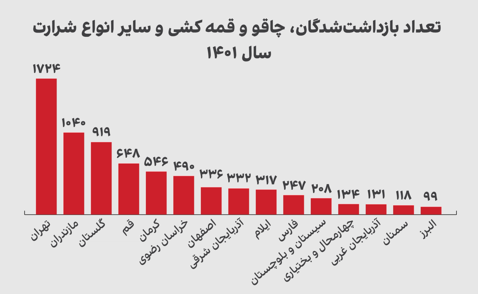آمار منتشر شده از سوی معاونت طرح و برنامه و بودجه فرماندهی انتظامی کل کشور نشان می‌دهد تعداد انواع شرارت‌ها شامل: «خفت‌گیری، زورگیری، اخاذی، چاقو و قمه‌کشی و سایر انواع شرارت‌ها در سال ۱۴۰۱ حدود ۸ هزار و ۱۳۰ مورد بوده که نسبت به پنج سال قبل افزایش ۲۱ درصدی داشته است.» همچنین تعداد قتل ثبت شده در سال ۱۳۹۶ حدود یک‌هزار و ۸۹۰ مورد بوده که با افزایش ۳۷ درصدی در سال ۱۴۰۱ به حدود دو‌هزار و ۵۹۰ مورد رسیده است. استان‌های تهران، مازندران، گلستان و قم به ترتیب بالاترین نرخ بروز شرارت در کل کشور را داشتند.