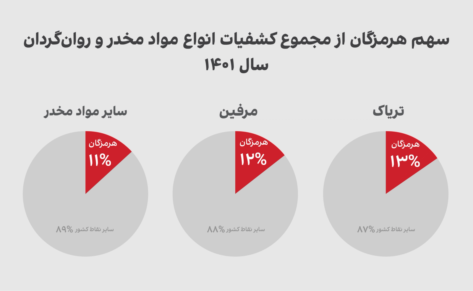 بنابر اطلاعات دبیرخانه ستاد مبارزه با مواد مخدر، از مجموع حدود ۶۹۷ تن کشفیات انواع مواد مخدر در سال ۱۴۰۱، پس از استان‌های سیستان و بلوچستان و کرمان، استان هرمزگان با حدود ۷۸ تن، سومین استان کشور از نظر نرخ کشفیات انواع مواد مخدر است. همچنین از مجموع حدود ۵۰۹ تن تریاک کشف شده در سال ۱۴۰۱، حدود ۶۷ تن آن مربوط به استان هرمزگان می‌شود که بازهم این استان در رتبه سوم کشوری است. در مورد ماده مرفین هم استان هرمزگان سهم ۱۲ درصدی از مجموع حدود ۱۳/۶ تن کشفیات سال ۱۴۰۱ داشته است.