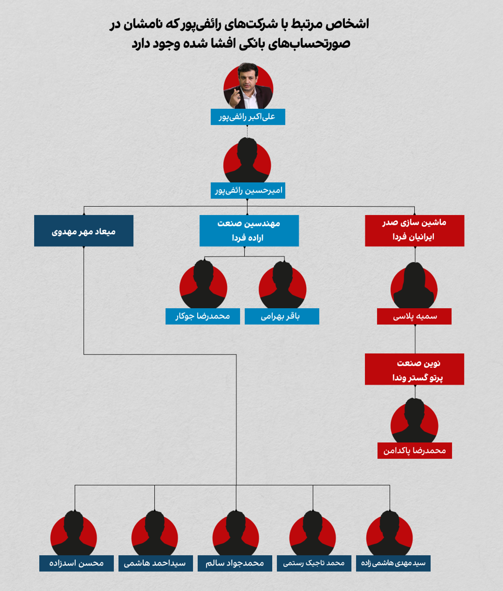 محمدرضا پاکدامن: او رییس هیات مدیره شرکت «نوین صنعت پرتو گستر وندا» است؛شرکتی که یکی از سهامداران آن سمیه پلاسی است. سمیه پلاسی در زمان تاسیس شرکت «ماشینسازی صدر ایرانیان فردا»، یکی از شرکتهای برادر علیاکبر رائفیپور به عنوان مدیرعامل آن معرفی شده بود.