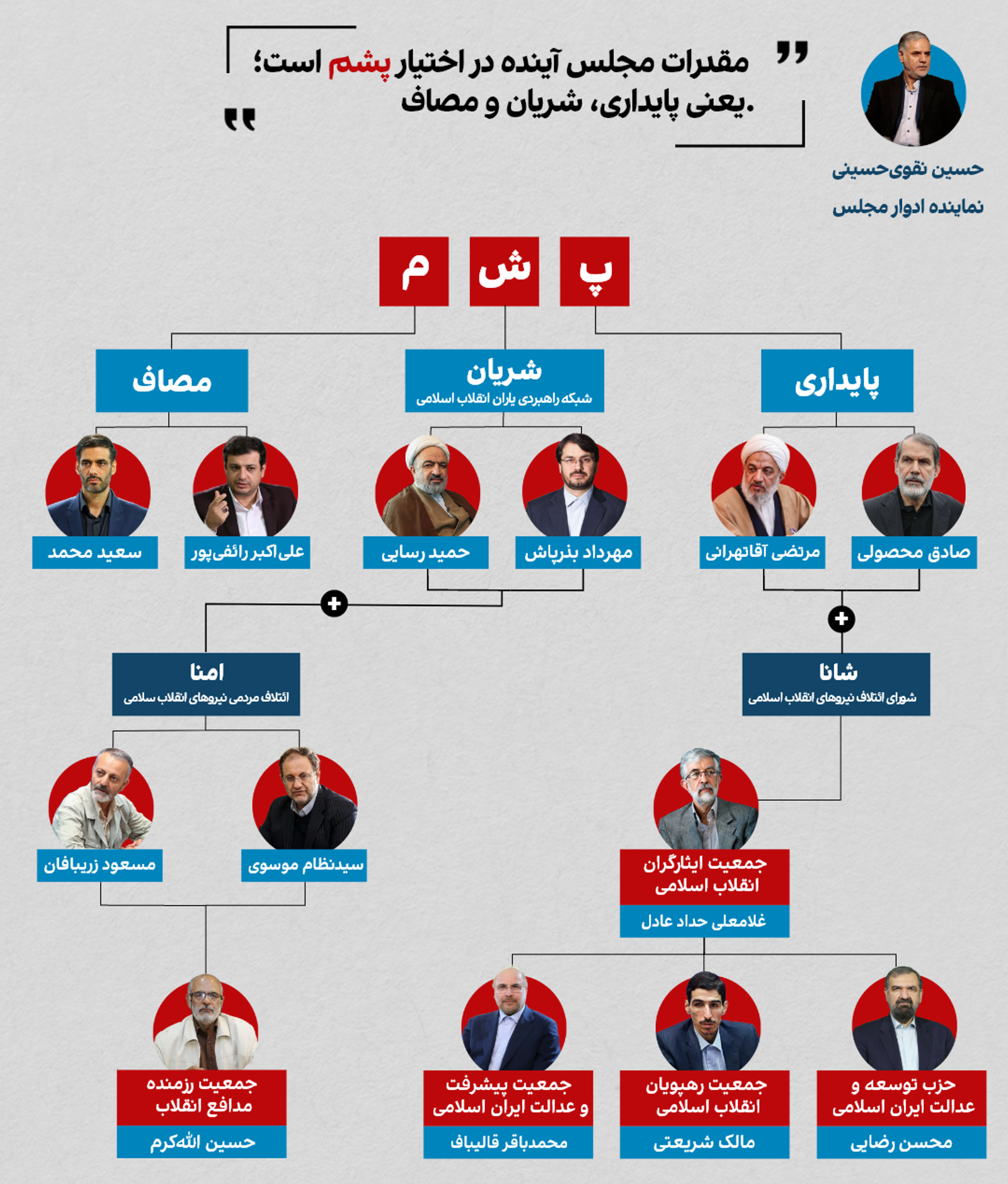 در روزهای پایانی فروردینماه ۱۴۰۳، حسین نقویحسینی، نماینده ادوار مجلس، درباره ترکیب مجلس دوازدهم گفت: «از نگاه بنده مقدرات مجلس آینده در اختیار پشم است یعنی پایداری، شریان و مصاف که این اصطلاح، توضیح مختصر و مفید این سه کلمه است.»