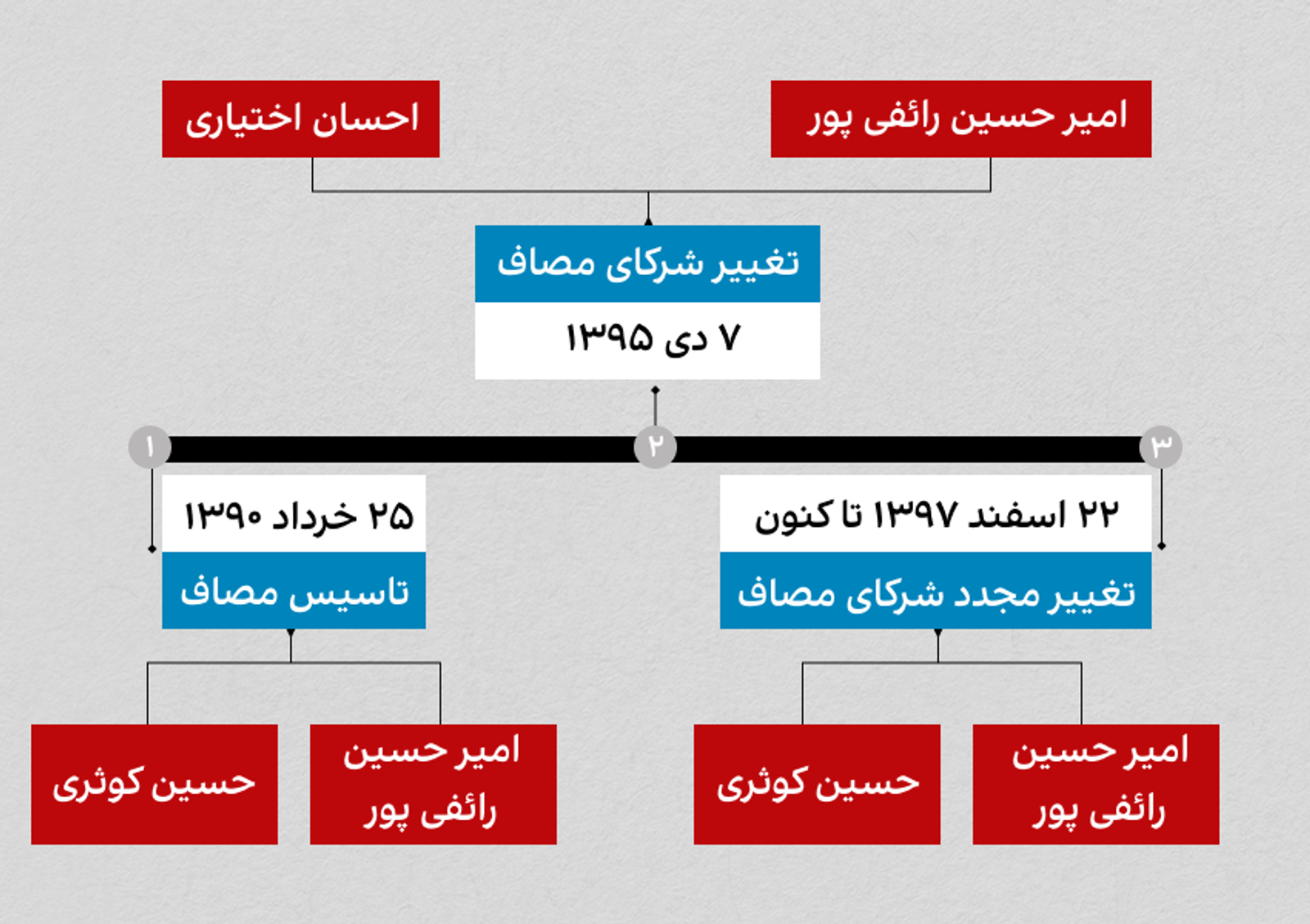 در دی ماه ۱۳۹۵، حسین کوثری با دریافت حق الشرکهاش از موسسه خارج و کمی بعد فردی به نام احسان اختیاری جایگزین شد. دوباره در اسفند ۱۳۹۷، حسین کوثری شریک و احسان اختیاری خارج شد. این شرح مختصری از وضعیت مصاف است.
