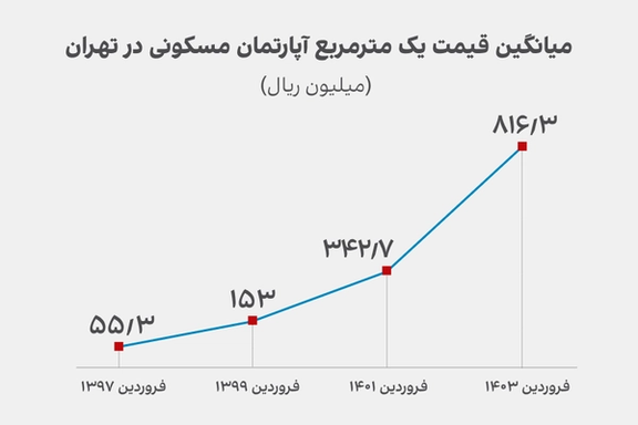 گزارش ماهانه بانک مرکزی از وضعیت بازار مسکن در تهران نشان میدهد میانگین قیمت آپارتمان در تهران در فروردین ۱۴۰۳ نسبت به فروردین پنج سال قبل، یعنی ۱۳۹۷، نزدیک به ۱۴ برابر و دقیقا یکهزار و ۳۷۶ درصد افزایش داشته است. در حالی که در این مدت، حداقل حقوق حدود ۶۸۰ درصد افزایش یافته است.
