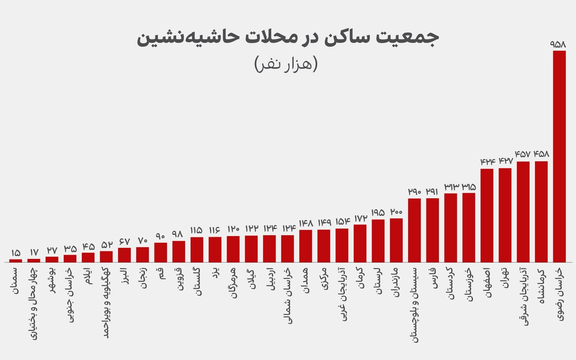 در دو دولت محمود احمدینژاد و دولت اول حسن روحانی یعنی بین سالهای ۱۳۸۵ تا ۱۳۹۷، رشد حاشیهنشینی در کشور حدود ۲۳ درصد بوده است اما در دولت دوم روحانی، میانگین رشد حاشیهنشینی در کشور به ۲۵ درصد رسید.