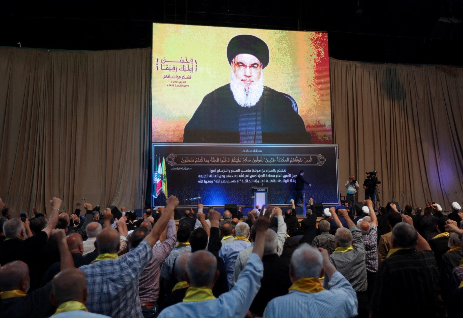 تجمع حامیان حزب‌الله در جریان سخنرانی تلویزیونی حسن نصرالله، دبیرکل این گروه، حومه جنوبی بیروت، هشتم خرداد