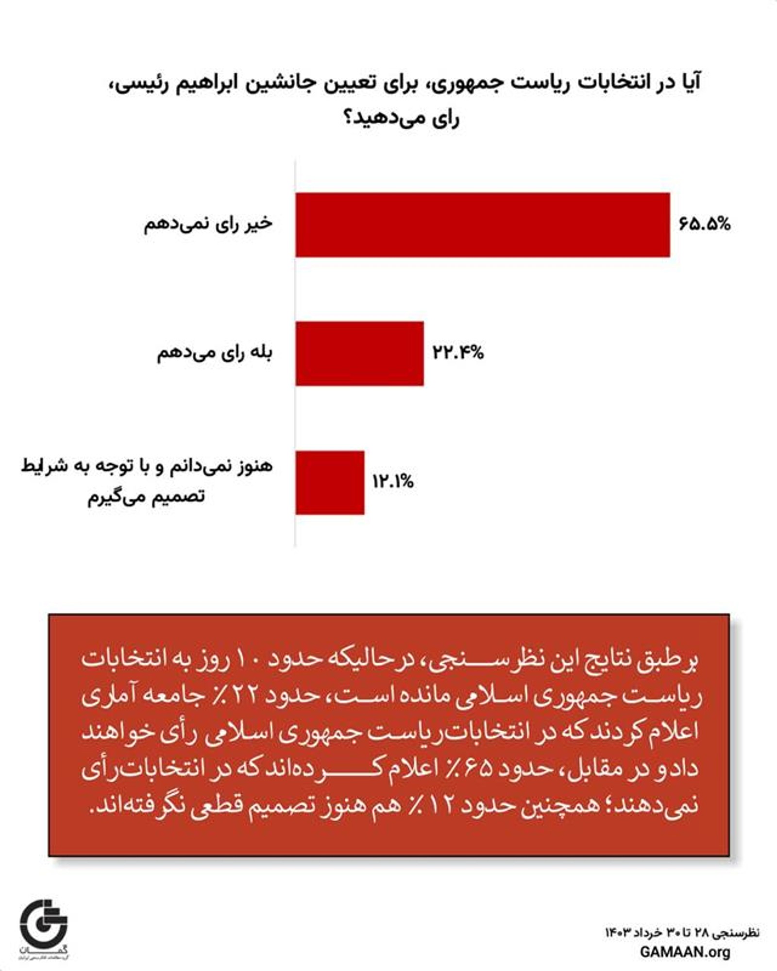 کمتر از یک هفته مانده به انتخابات ریاستجمهوری در ایران، نتایج نظرسنجی گروه مطالعات افکارسنجی ایرانیان (گمان) نشان میدهد که بیش از ۶۵ درصد از مردم ایران در این انتخابات شرکت نخواهند کرد.