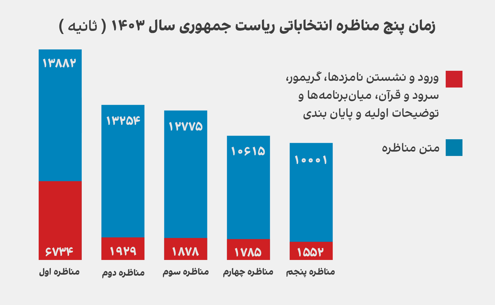 متن پنج مناظره مجموعا ۶۰ هزار و ۵۲۷ ثانیه برابر ۱۶ ساعت و ۴۸ دقیقه و ۴۷ ثانیه بوده است. بهای این زمان با کمترین نرخ آگهی در شبکه یک، حدودا برابر ۱۲۱ میلیارد تومان است.