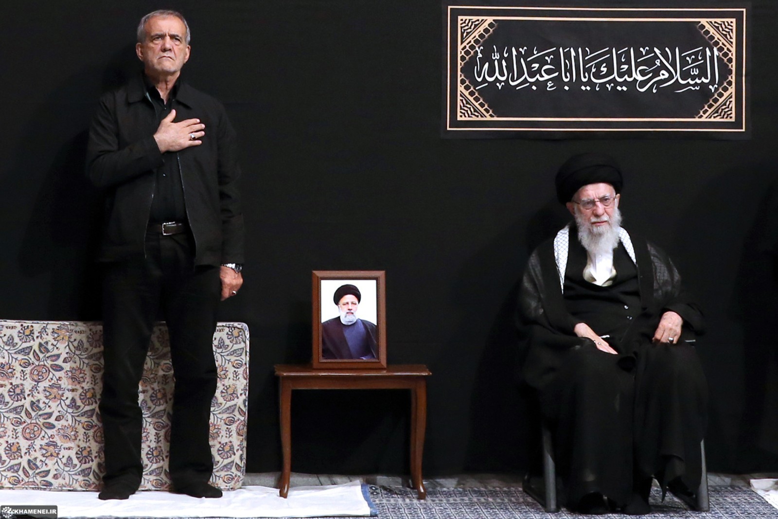 ۲۲ تیر، پزشکیان به «حسینیه امام خمینی»، متعلق به علی خامنهای رفت و در مراسم عزاداری برپا شده از سوی رهبر جمهوری اسلامی برای امام سوم شیعیان شرکت کرد.