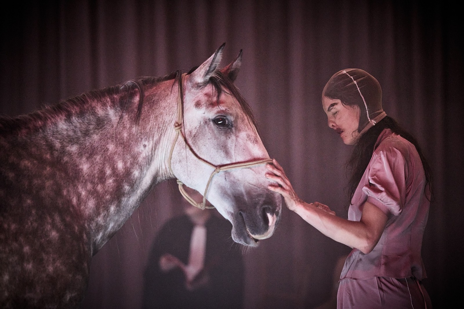 این فضای شبه سوررئال با ورود یک اسب تکان‌دهنده می‌شود: یک اسب واقعی قهوه‌ای-سفید بزرگ بدون راهنما وارد صحنه می‌شود و تا نزدیک به انتها روی صحنه می‌ماند. اسب به طرز عجیبی به بازیگر نمایش بدل می‌شود: در گوشه‌های مختلف صحنه راه می‌رود و بی‌آن که کسی هدایتش کند، با ساختار و محتوای صحنه هماهنگ می‌شود. او هم گویی به بی‌عدالتی‌های بشر اعتراض دارد و با نگاهی عاقل اندر سفیه، به شخصیت‌های نمایش چشم می‌دوزد. در صحنه‌ای حیرت‌انگیز- که مشخص نیست در نمایشنامه آمده یا اتفاقی رخ می‌دهد- اسب به جلوی میز قاضی می‌رود و کتاب قانون را با دهانش برمی‌دارد، آن را می‌جود و به گوشه‌ای پرت می‌کند. از بین شخصیت‌های روی صحنه اسب زنی را انتخاب می‌کند که از همه مظلوم‌تر به نظر می‌رسد، در نتیجه در غالب اوقات کنار او می‌ایستد و زن اسب را نوازش می‌کند.
