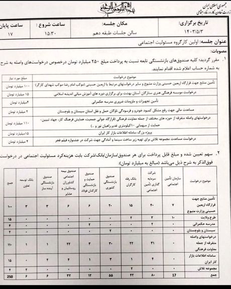 بر اساس این سند، در تاریخ سوم مرداد در جلسهای با عنوان «اولین کارگروه مسئولیت اجتماعی»، مقرر شده است مبلغ ۲۵۰ میلیارد تومان از کلیه صندوقهای بازنشستگی تابع این وزارتخانه «برای اهدافی مانند مراسمها و آموزشهای مذهبی» دریافت و هزینه شود.