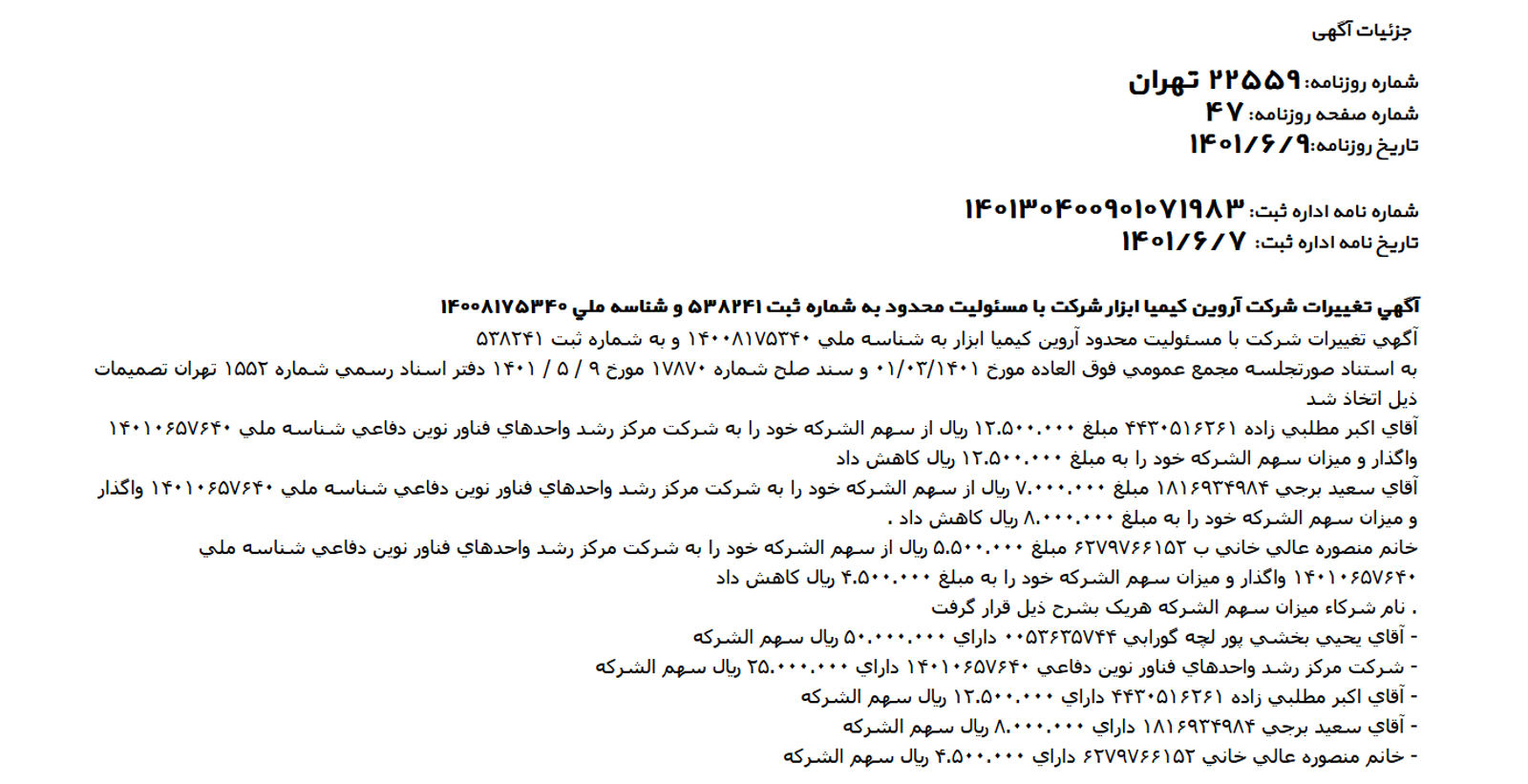 او بخشی از سهامش در این شرکت را در شهریور سال ۱۴۰۱ به مرکز رشد واحدهای فنآور نوین دفاعی متعلق به سپند واگذار کرد.