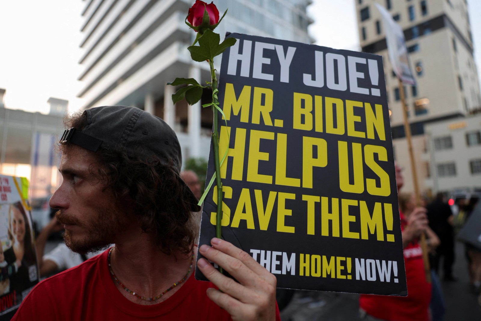 حضور تظاهرکنندگان اسرائیلی در خارج از محل نشست خبری بلینکن و درخواست آن‌ها از آمریکا برای کمک به آزادی گروگان‌های در بند حماس، تل‌آویو، ۲۹ مرداد