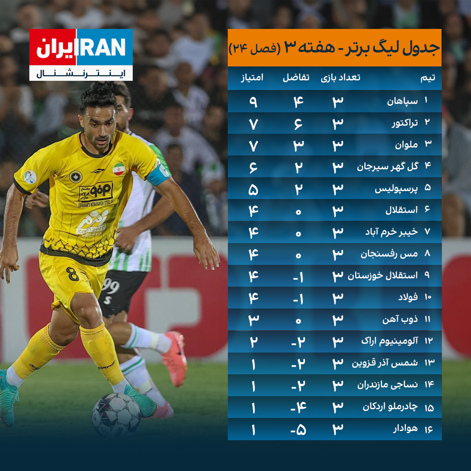 جدول لیگ برتر، هفته سوم؛ صدرنشینی مطلق سپاهان