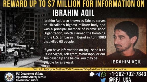 وزارت خارجه آمریکا نام ابراهیم عقیل را از ۲۱ ژوئیه ۲۰۱۵ در فهرست افراد تحت تعقیب خود قرار داد و برای بازداشت یا گرفتن اطلاعاتی از محل اختفای او ۷ میلیون دلار جایزه تعیین کرد و از ۱۹ سپتامبر سال ۲۰۱۹هم نام او را به فهرست «تروریسم» اضافه کرد.