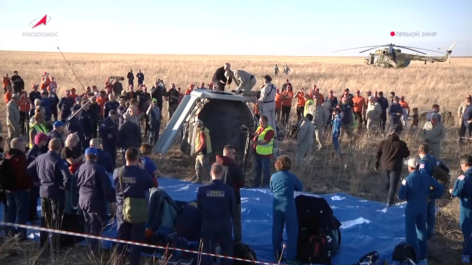 پس از فرود، فضانوردان از کپسول بیرون کشیده شدند و روی صندلیهایی قرار گرفتند که برای انطباق آنها با گرانش زمین در نظر گرفته شده بود.
