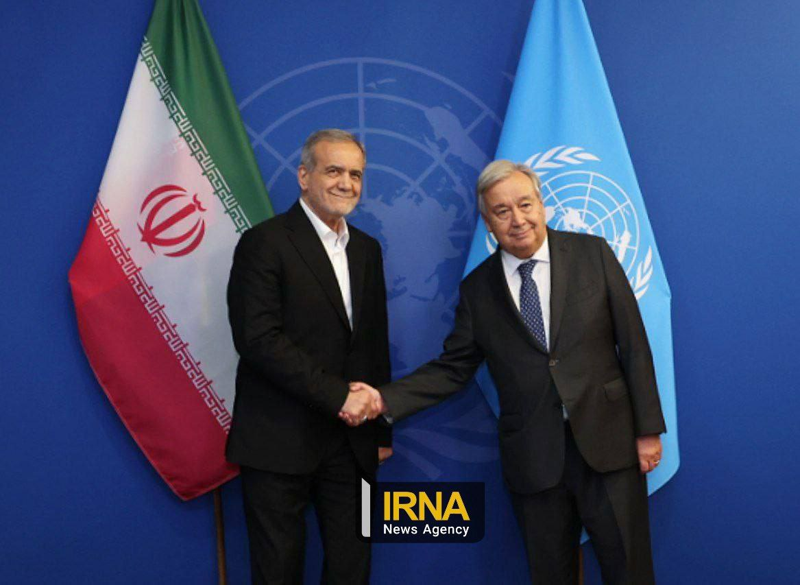 مسعود پزشکیان در حاشیه مجمع عمومی سازمان ملل با آنتونیو گوترش، دبیرکل سازمان ملل، درباره جنگ در غزه، و همچنین وضعیت لبنان و یمن گفتوگو کردند.