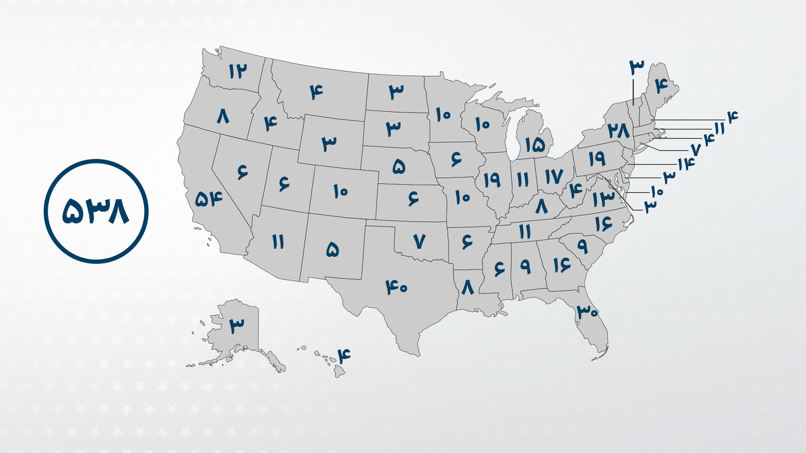 نقشه آرای الکترال در انتخابات ریاست جمهوری آمریکا؛ مجموع آرا ۵۳۸ است و کاندیدا برای پیروزی به ۲۷۰ رای نیاز دارد.