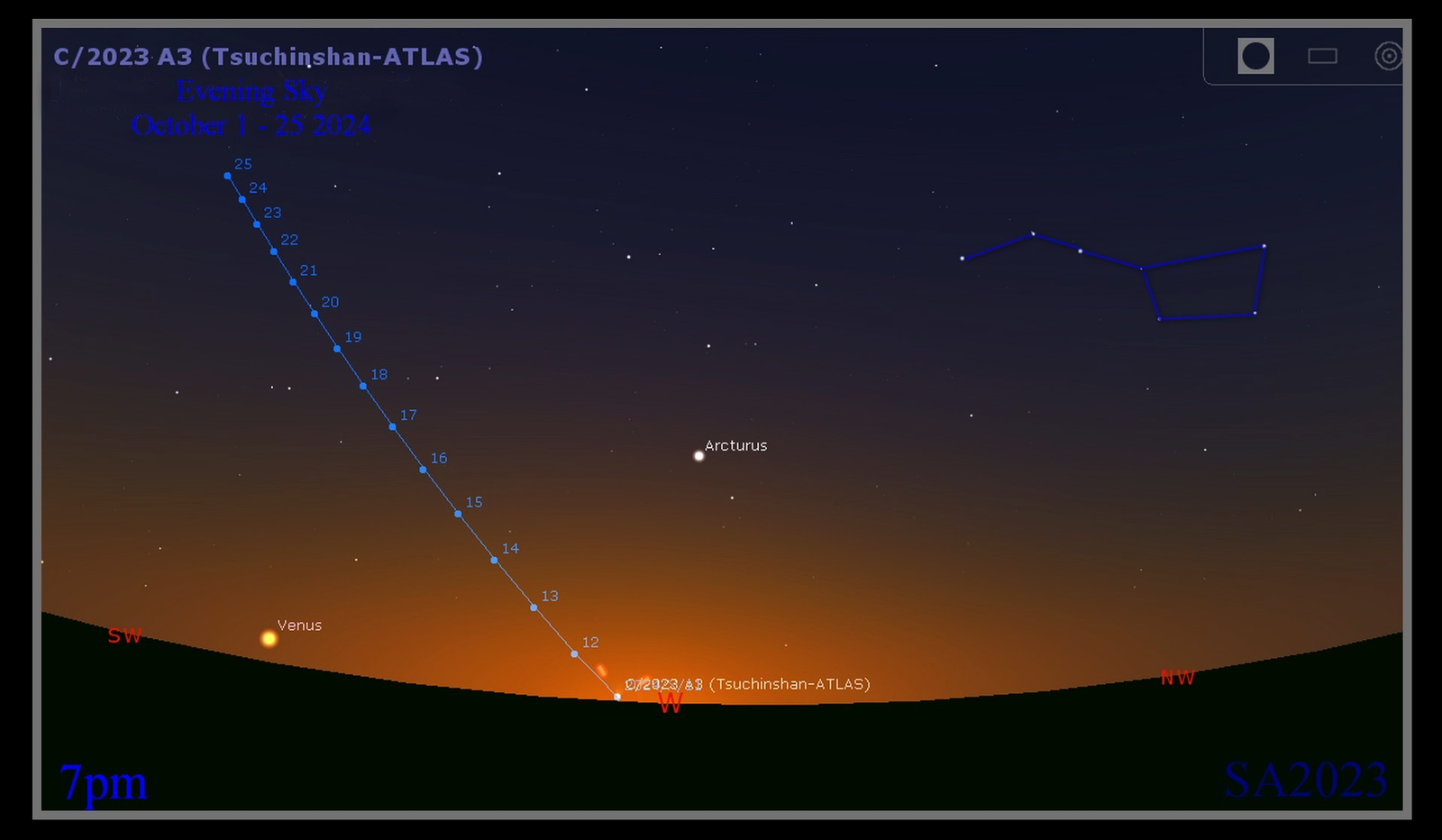 دنباله‌دار سوچینشان-اطلس هم‌اکنون در فاصله کمی از خورشید در صورت فلکی دوشیزه یل ویرگو قرار داد و در روزهای آتی از خورشید دورتر و دورتر می‌شود. این دنباله‌دار به تدریج ارتفاع بیشتری در آسمان پیدا می‌کند و تشخیص آن آسان‌تر می‌شود.